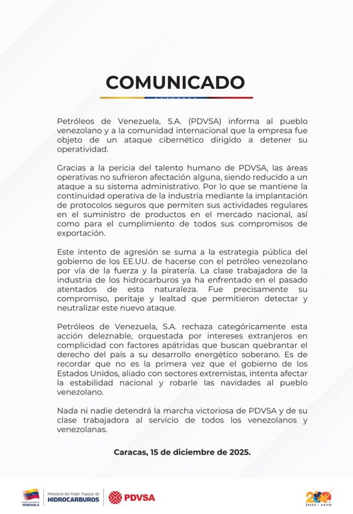 Bajo este orden de ideas, la estatal rechazó «esta acción deleznable, orquestada por intereses extranjeros, en complicidad con factores apátridas que buscan quebrantar el derecho del país a su desarrollo energético soberano. Es de recordar que no es la primera vez que el gobierno de los Estados Unidos, aliado con sectores extremistas, intenta afectar la estabilidad nacional y robarle las Navidades al pueblo venezolano».