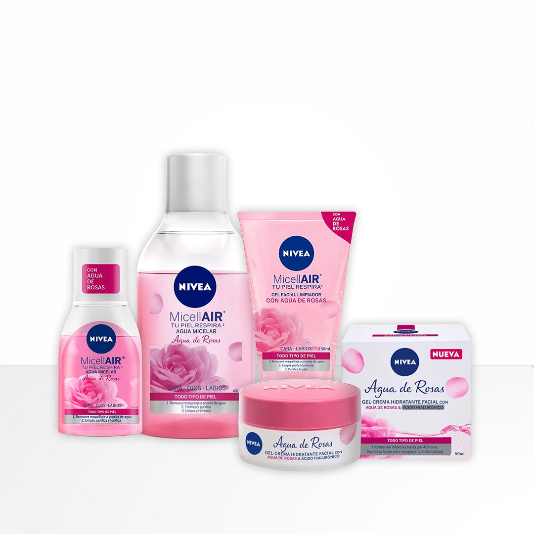 La colección incluye Agua Micelar, Gel Limpiador y Gel-Crema Facial, cada uno enriquecido con Agua de Rosas Orgánica para una piel limpia, suave, hidratada y revitalizada