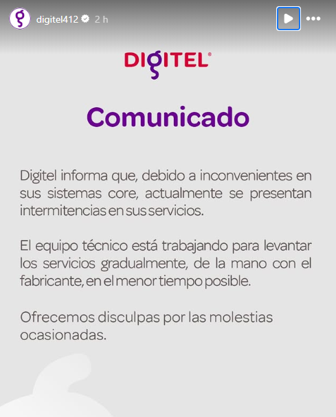 De acuerdo a lo indicado por Digitel, el inconveniente se registró en sus sistemas core lo que lleva a presentar “intermitencias” en sus diversos servicios.