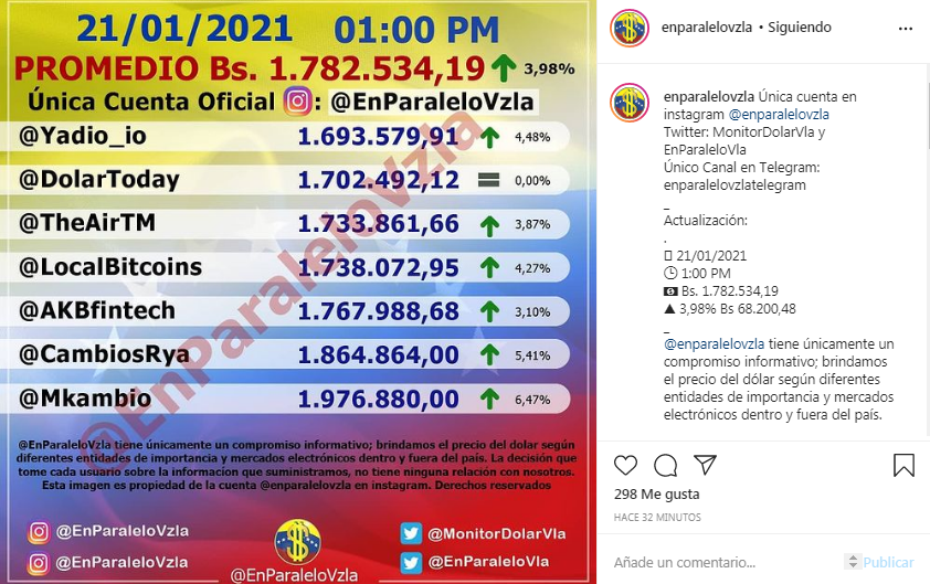La tarde de este jueves, 21 de enero, la cotización del dólar en el mercado paralelo cerró en Bs 1.782.534,19, de acuerdo a lo reflejado en la cuenta de Instagram @EnParaleloVzla.