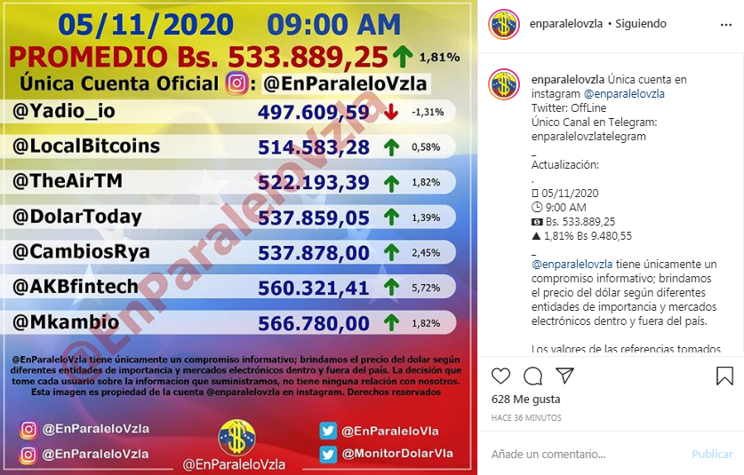 La valoración del dólar en el mercado paralelo inició su jornada este jueves, 5 de noviembre, en Bs 533.889,25, según lo reflejado en la cuenta de Instagram @EnParaleloVzla.