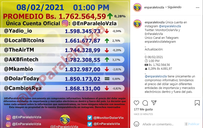 El tipo de cambio del dólar paralelo presentó un incremento la tarde de este lunes, 8 de febrero, al ubicarse en Bs. 1.762.564,56, de acuerdo a lo reflejado en la cuenta de Instagram @EnParaleloVzla.