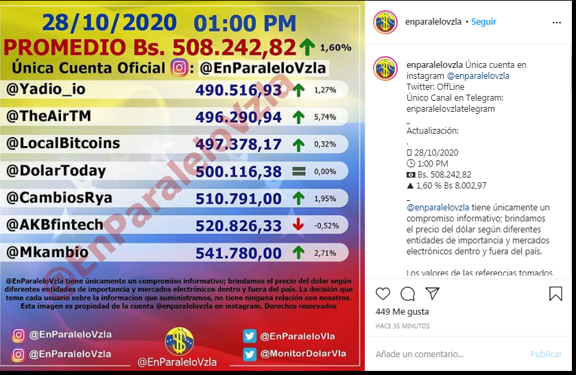 La valoración del dólar en el mercado paralelo presentó otro incremento en el día de hoy, miércoles, 28 de octubre, al ubicarse hacia su cierre en Bs 508.242,82, de acuerdo a la cuenta de Instagram @EnParaleloVzla.