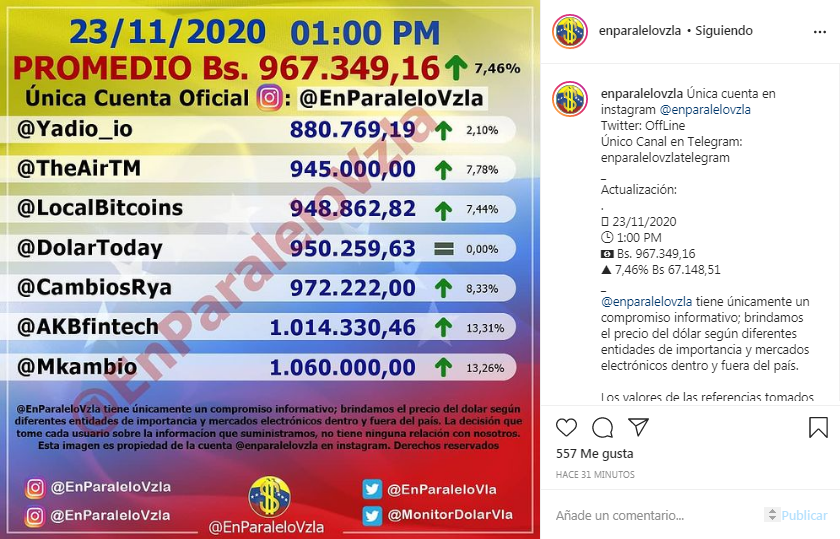 El valor del dólar en el mercado paralelo incrementó la tarde de este lunes, 23 de noviembre, al posicionarse en Bs 967.349,16, de acuerdo con lo reflejado en la cuenta de Instagram @EnParaleloVzla.