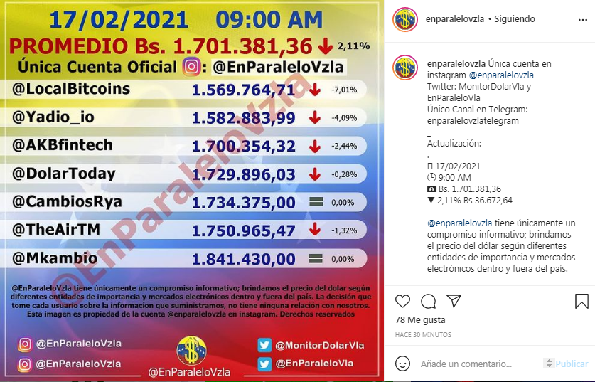 La valoración del dólar en el mercado paralelo presentó un retroceso la mañana de este miércoles, 17 de febrero, al posicionarse en Bs 1.701.381,36, de acuerdo a lo señalado en la cuenta de Instagram @EnParaleloVzla.