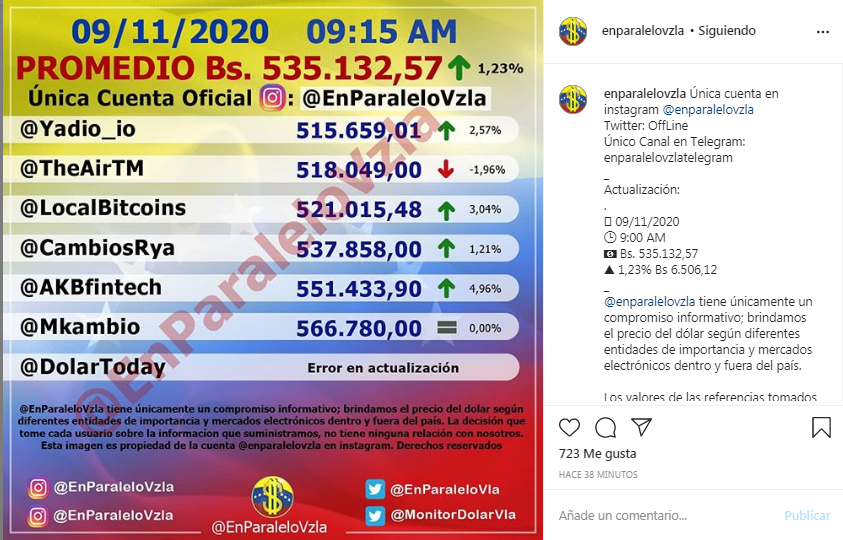 La valoración del dólar en el mercado paralelo inició la semana al alza, al posicionarse este lunes, 9 de noviembre, en Bs 535.132,57, así lo refleja la cuenta de Instagram @EnParaleloVzla.