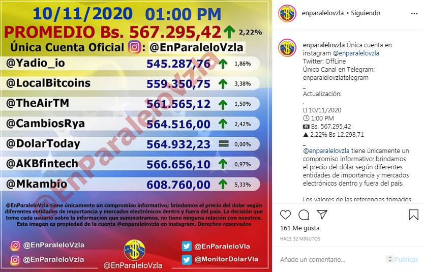 El tipo de cambio del dólar en el mercado paralelo cerró la tarde de este martes, 10 de noviembre, en Bs 567.295,42, según lo indica la cuenta de Instagram @EnParaleloVzla.