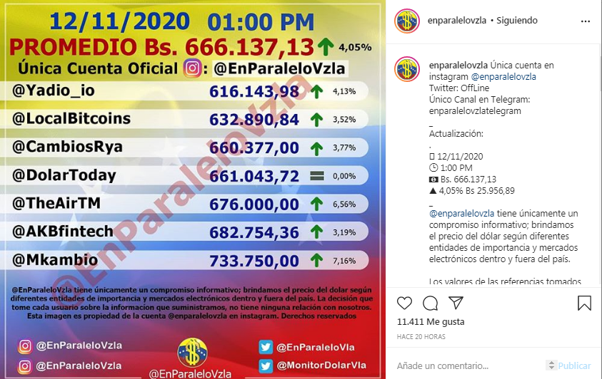 El tipo de cambio del dólar en el mercado paralelo continúa incrementando, se ubica este viernes, 13 de noviembre, en su apertura, en Bs 685.256,55, según lo establecido en la cuenta de Instagram @EnParaleloVzla.
