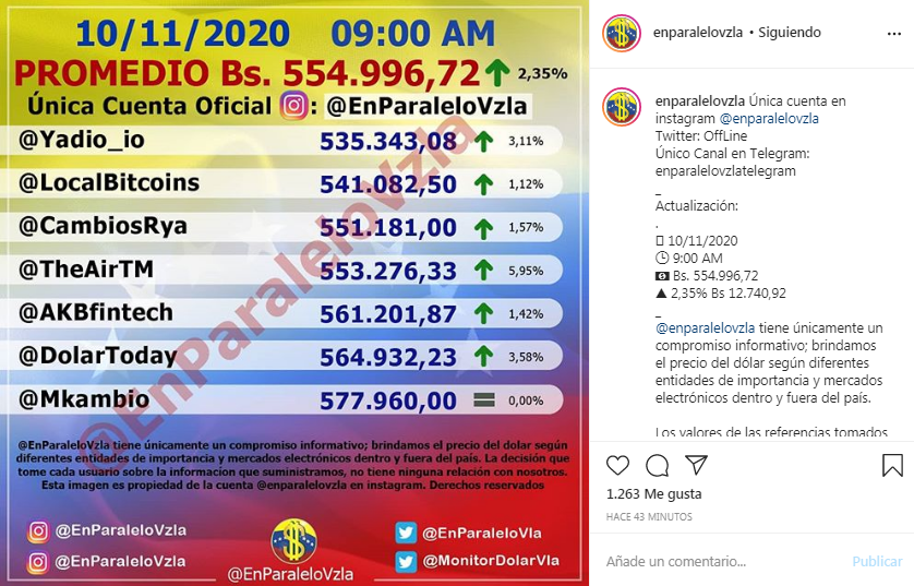 La cotización del dólar en el mercado paralelo presentó otro incremento considerable, al ubicarse este martes, 10 de noviembre, en Bs 554.996,72, así lo indica la cuenta de Instagram @EnParaleloVzla.