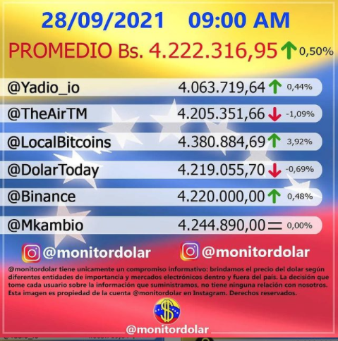 EconomíaTipo de Cambio Dólar paralelo abrió al alza el martes #28Sep 28 septiembre, 2021 Share FacebookXPinterestWhatsApp La cotización de la divisa estadounidense abrió este martes en 4.222.316,95 bolívares por dólar, lo que refleja un aumento de 0,50%% al ser comparado con el cierre de la cotización del lunes de 27 de septiembre