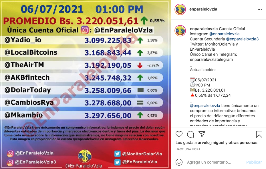 Este martes 6 de julio, @EnParaleloVzla, ubica a la divisa norteamericana a un precio promedio de Bs 3.220.051,61 lo que representa un descenso de 0,55% o 17.772,24 bolívares, en comparación con el precio precedente.