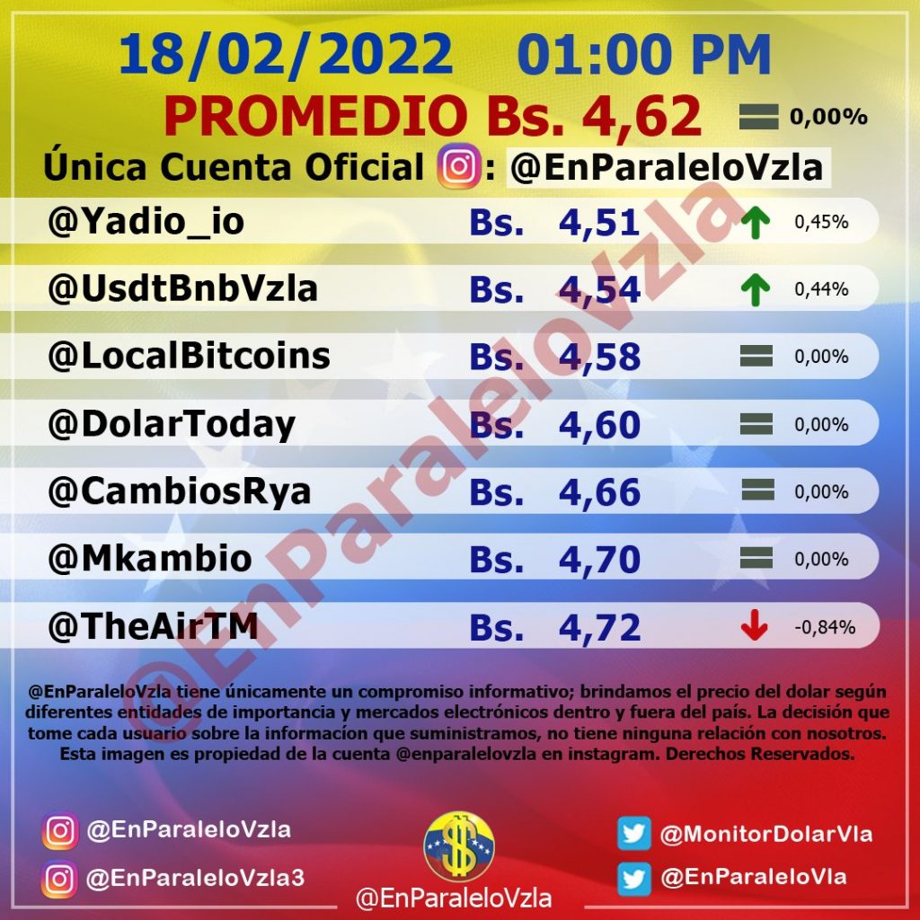El dólar paralelo cerró este viernes estable y se ubicó en Bs 4,62, precio el cual mantendrá para sábado y domingo en Venezuela, ya que es el referente económico para las transacciones comerciales.