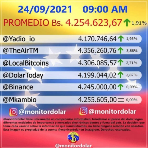 EconomíaTipo de Cambio Dólar paralelo mantiene tendencia al alza en la apertura del #24Sep 24 septiembre, 2021 Share FacebookXPinterestWhatsApp La cotización de la divisa estadounidense comenzó a cotizarse este martes en 4.254.623,67 bolívares por dólar, lo que refleja un aumento de 1,91% al ser comparado con el cierre de la cotización del lunes de 23 de septiembre.