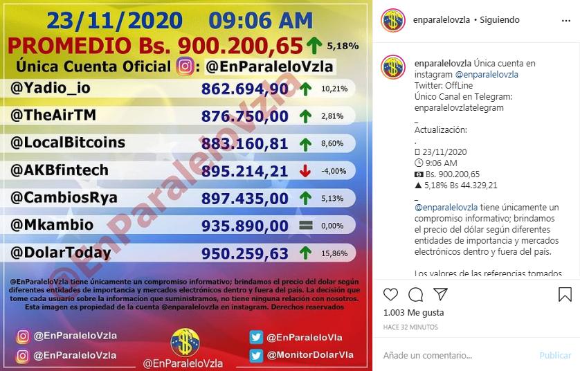 La cotización del dólar en el mercado paralelo presentó un gran incremento, al ubicarse este lunes, 23 de noviembre, en Bs 900.200,65, de acuerdo a lo reflejado en la cuenta de Instagram @EnParaleloVzla.