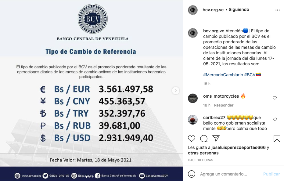 Por su parte, el dólar oficial en la tasa de cambio del Banco Central de Venezuela (BCV), se ubicó en 2.931.949,40 bolívares.