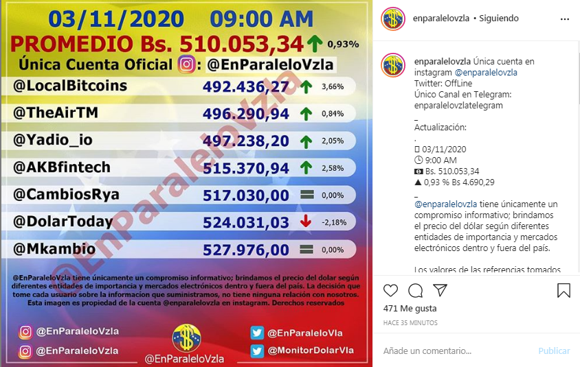 El precio del dólar en el mercado paralelo abrió su jornada este martes, 3 de noviembre, en Bs 510.053,34, según lo indicado en la cuenta de Instagram @EnParaleloVzla.