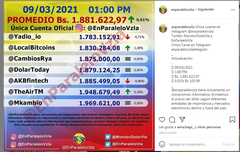 En cambio, @monitordolar.vzla desciende -0,47% y cierra en Bs.1.877.622,41 por dólar este martes.
