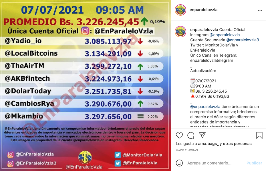Este miércoles 7 de julio, @EnParaleloVzla, ubica a la divisa norteamericana a un precio promedio de Bs 3.226.245,45 lo que representa un descenso de 0,19% o 6.193,67 bolívares, en comparación con el precio precedente.