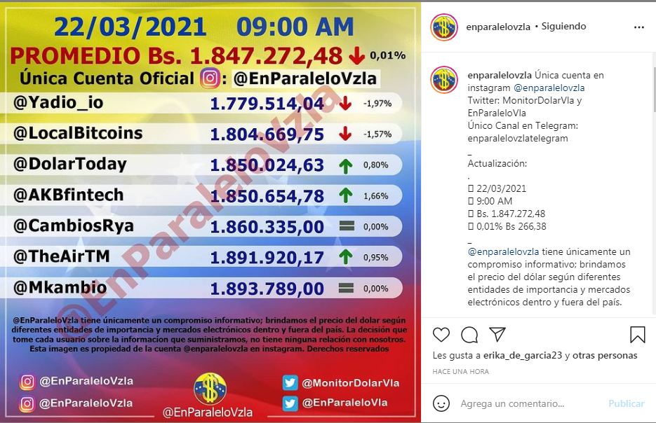 La cotización del dólar en el mercado paralelo presentó un mínimo incremento, al ubicarse la mañana de este lunes, 22 de marzo, en Bs 1.847.272,48, según refleja la cuenta de Instagram @EnParaleloVzla.