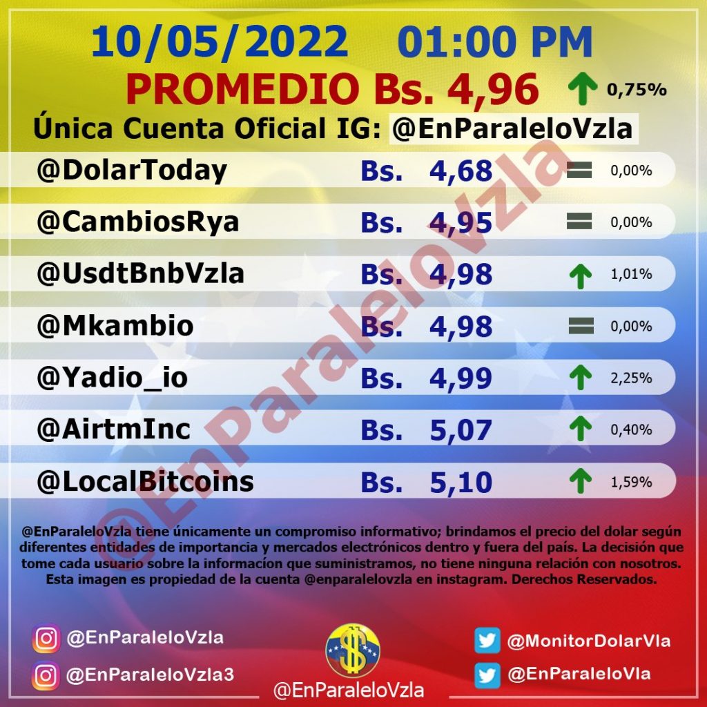 El dólar paralelo registró un leve incremento al cierre de la jornada de este martes y se ubicó en Bs 4,95. Es el referente para klas transacciones económicas en Venezuela.