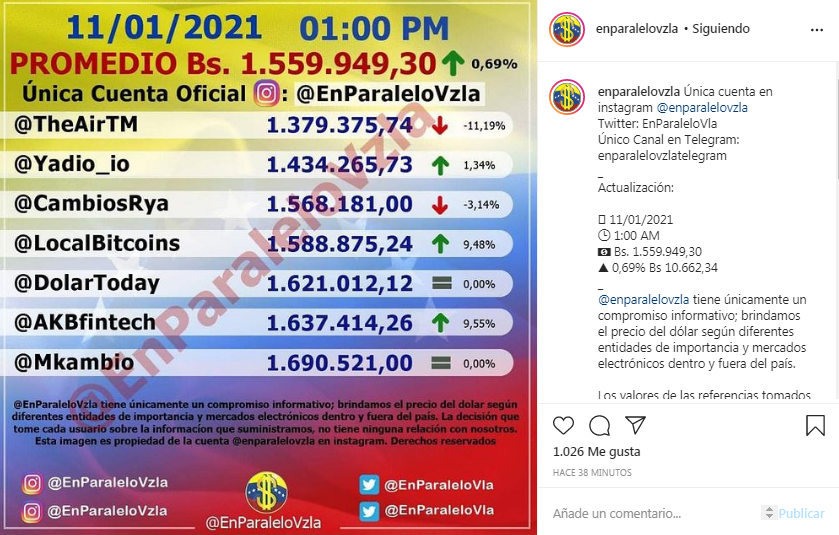 La cotización del dólar en el mercado paralelo presentó un leve incremento, la tarde de este lunes, 11 de enero, al ubicarse en Bs 1.559.949,30, así lo indica la cuenta de Instagram @EnParaleloVzla.