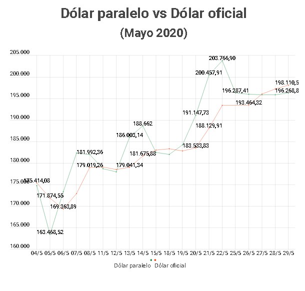 En cinco meses el dólar paralelo, utilizado como referencia para los pagos en el país, subió Bs 142.245,49 o 263,3% luego de cerrar el año 2019 en Bs 54.023,39 y ubicarse este viernes 29 de mayo en 196.268,88.