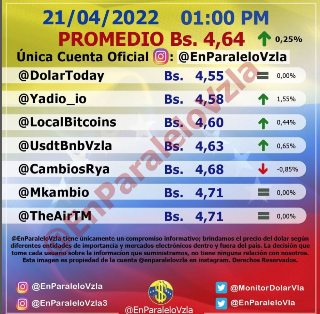 EconomíaTipo de Cambio ¿En cuánto cerró el dólar paralelo este #21Abr? 21 abril, 2022 Foto: Pixabay. Share FacebookXPinterestWhatsApp La variación respecto a la cotización de apertura fue de +0,25% El dólar paralelo registró un leve incremento al cierre de la jornada de este jueves y se ubicó en Bs 4,64 Es el referente para las transacciones comerciales en Venezuela..