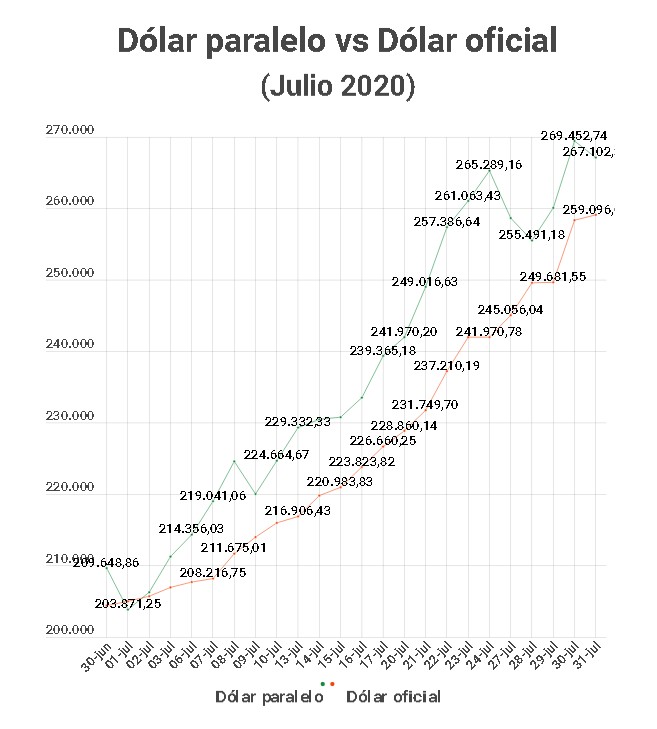 En el mercado paralelo ,el aumento fue de Bs 57.453,45 o 27,4%, al cerrar el 30 de junio en Bs 209.648,86 y subir hasta los Bs 267.102,31.