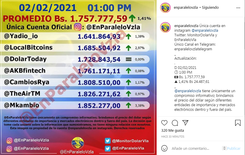La tarde de este martes, 2 de febrero, la valoración del dólar en el mercado paralelo presentó otro incremento, y se ubicó en Bs. 1.757.777,59, de acuerdo con lo reflejado en la cuenta de Instagram @EnParaleloVzla.