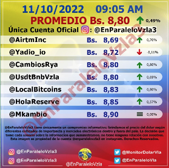 La cotización del dólar en el mercado paralelo presentó una variación en relación al cierre del pasado lunes, su valor en la mañana de este martes 11 de octubre es de Bs. 8,80 de acuerdo a la cuenta @EnParaleloVzla de instagram.