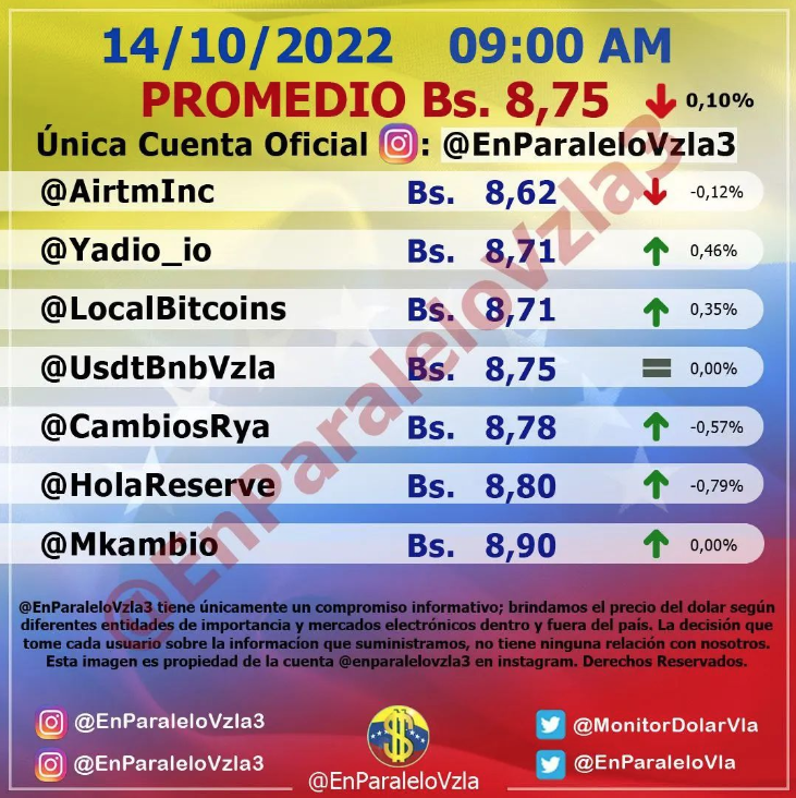 La cotización del dólar en el mercado paralelo presentó una variación en relación al cierre del pasado jueves, su valor en la mañana de este viernes 14 de octubre es de Bs. 8,75 de acuerdo a la cuenta @EnParaleloVzla de instagram.
