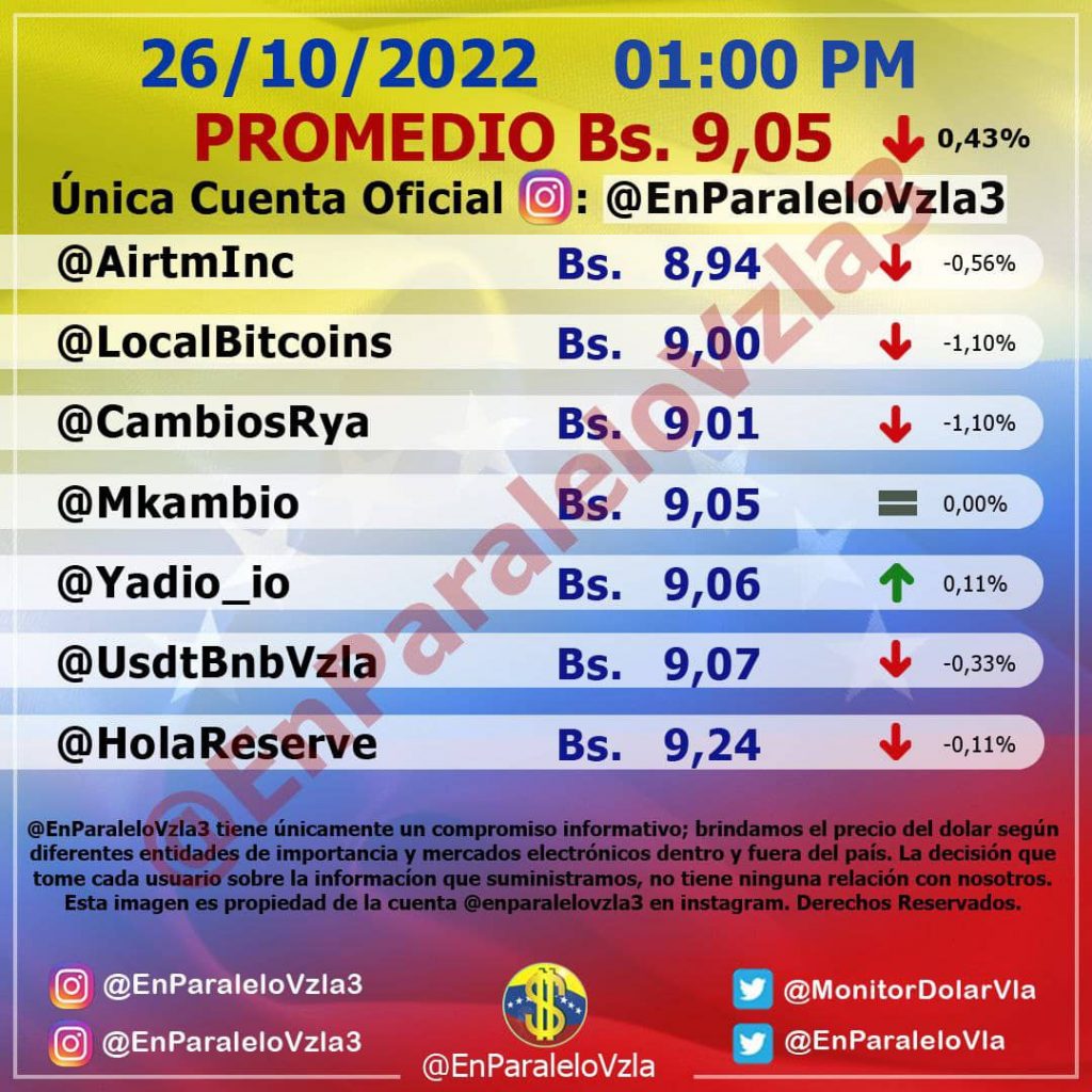 El dólar paralelo cerró este miércoles 26 de octubre en 9,05 bolívares, con una leve alza con respecto a la mañana. Mientras que la divisa en el mercado oficial del Banco Central de Venezuela se ubicó en Bs. 8,40.