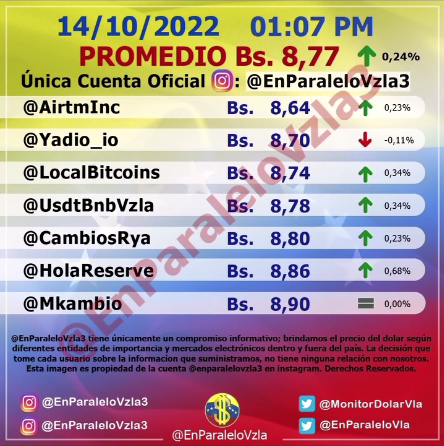 La cotización del dólar en el mercado paralelo presentó una variación en relación a la apertura de este viernes, su valor en la tarde de este 14 de octubre es de Bs. 8,77 de acuerdo a la cuenta @EnParaleloVzla de instagram.