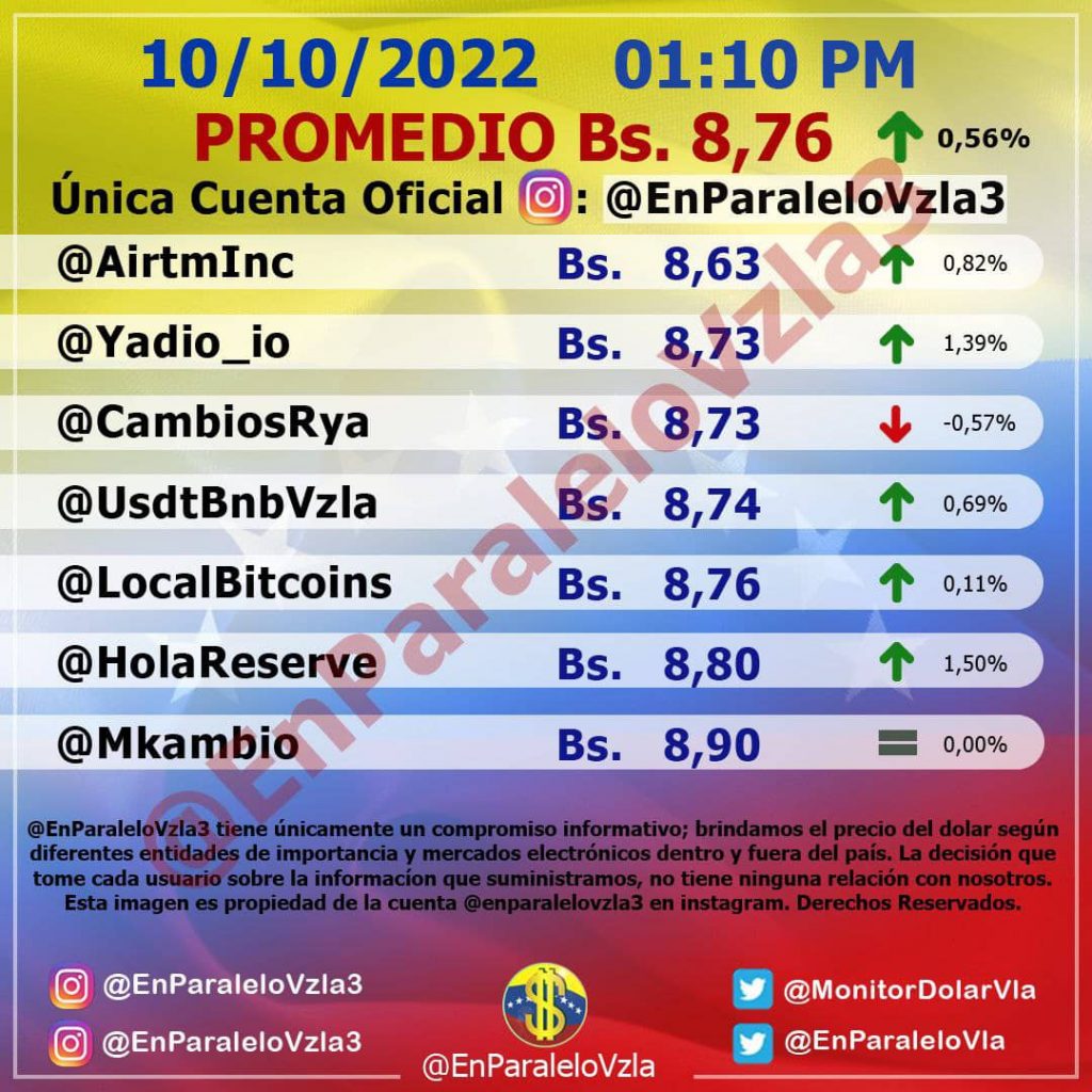 La cotización del dólar en el mercado paralelo presentó una leve variación en relación a la apertura de este lunes. Su valor en el cierre de la jornada de este 10 de octubre se ubicó en Bs. 8,76 de acuerdo a la cuenta @EnParaleloVzla de instagram.