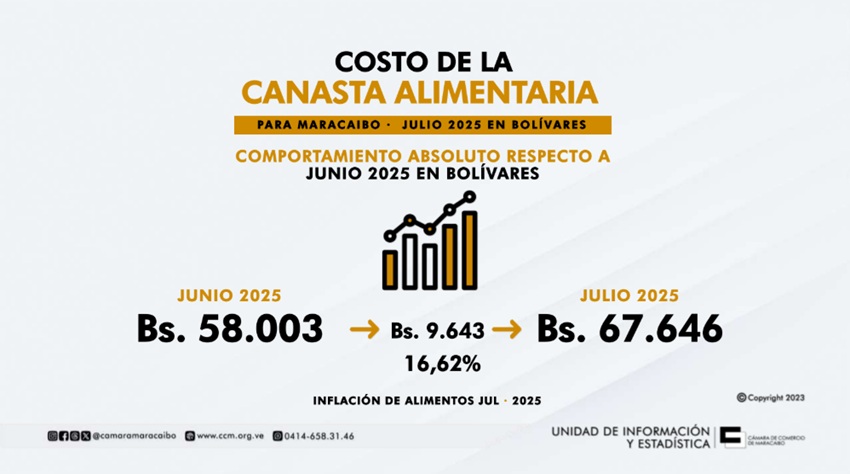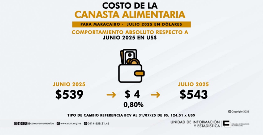 La Cámara de Comercio de Maracaibo (CCM), a través de su Unidad de Información y Estadísticas, informó que la Canasta Alimentaria de Maracaibo en julio de 2025, se ubicó en 543 dólares o Bs. 67.646.