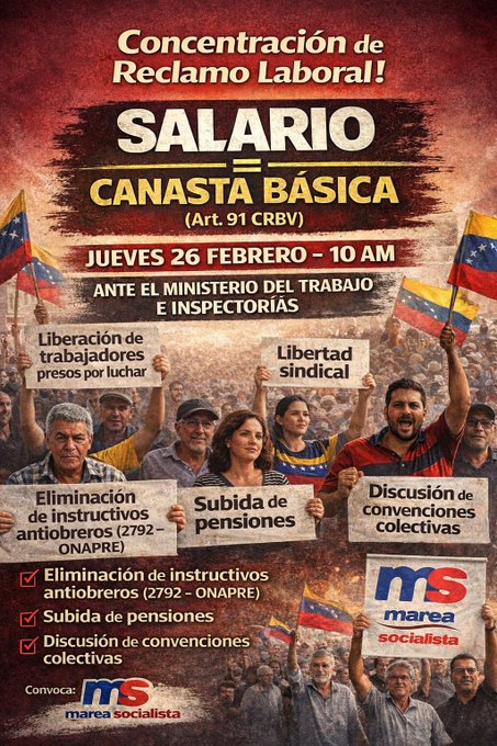 «Presentaremos un Pliego Nacional con exigencias ante el Ministerio del Trabajo en Caracas y en las Inspectorías de cada estado, por las constantes violaciones de los derechos laborales y para exigir #SalarioIgualCanastaBásica (Art91CRBV)», registró Marea Socialista en un post.