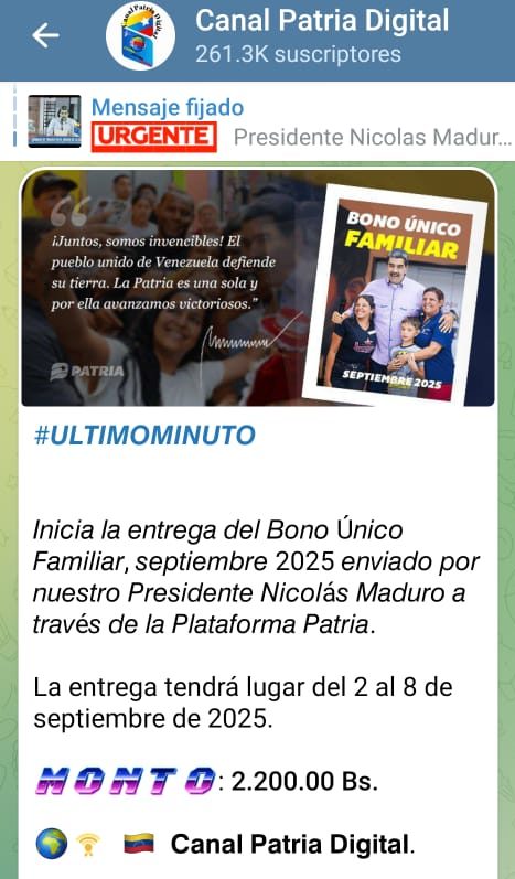 A través de sus redes sociales, el Canal Patria Digital informó que el monto asignado es de Bs. 2.200 o 14,71 dólares al tipo de cambio vigente del Banco Central de Venezuela (BCV).