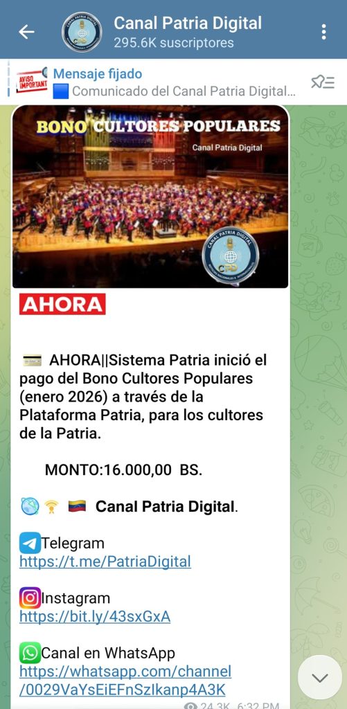 Desde este 29 de enero de 2026, inició el pago del bono «Cultores Populares», correspondiente al mes en curso, a través de la Plataforma Patria.
