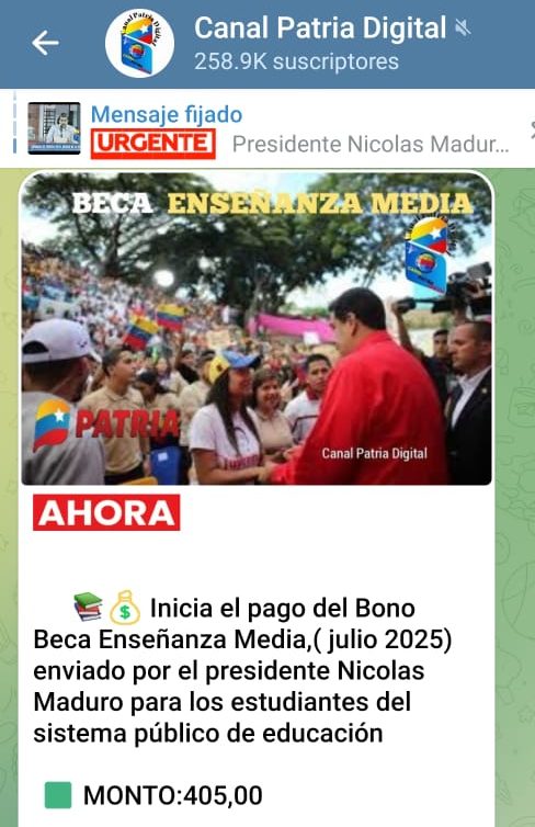 «Plataforma Patria comienza la entrega del Bono Beca Enseñanza Media, (julio 2025) enviado por el presidente Nicolás Maduro para los estudiantes del sistema público de educación», indica el mensaje difundido a través de las redes sociales oficiales.