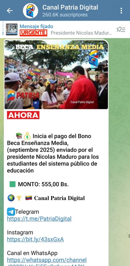 Desde este 10 de septiembre de 2025, inició la entrega del bono «Beca Enseñanza Media», correspondiente al mes en curso, a través de la Plataforma Patria.