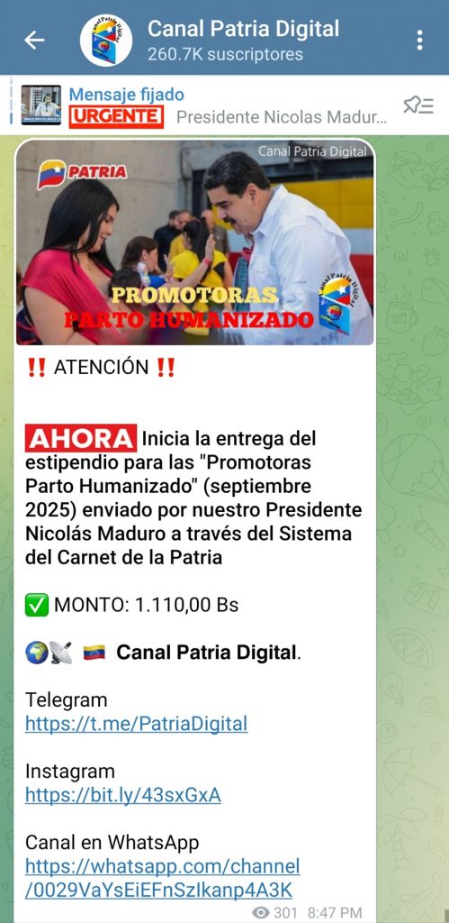 El Canal Patria Digital señaló en sus redes sociales que el monto otorgado es de Bs. 555 o 3,54 dólares al tipo de cambio vigente del Banco Central de Venezuela (BCV).