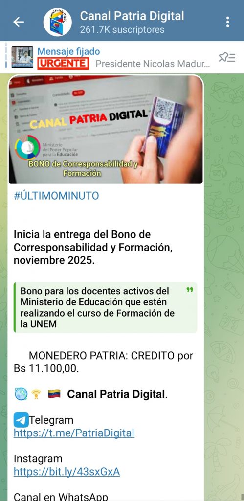 Este viernes 7 de noviembre de 2025 comenzó el pago del bono de «Corresponsabilidad y Formación», correspondiente al mes en curso, a través de la Plataforma Patria.