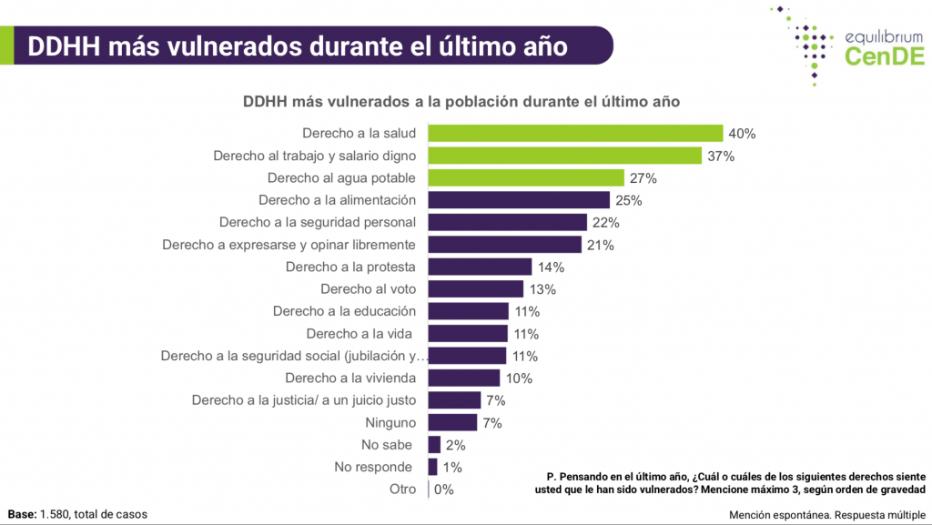 Señala que el estudio arrojó que los venezolanos sienten que los derechos más vulnerados durante el último año son la salud y el derecho “al trabajo digno y salario digno”.