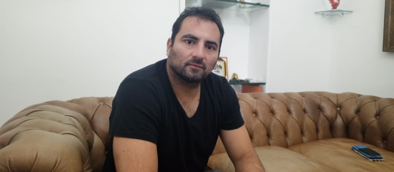 El fotoperiodista viste de franela color negro, se deja notar su forma sencilla de formular sus ideas y desarrollar su propia narrativa.