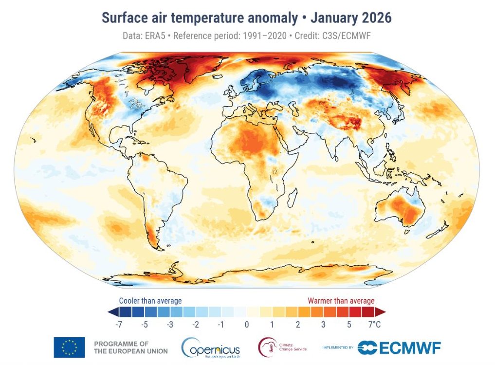 El de 2026 es el quinto mes de enero más cálido a escala global desde que hay registros, con extremos de temperaturas contrastantes en los hemisferios norte y sur, según datos del Servicio de Cambio Climático de Copernicus (C3S), el programa de observación de la Tierra de la Unión Europea (UE).