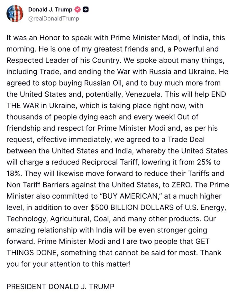 En un comunicado emitido recientemente, el presidente de los Estados Unidos, Donald J. Trump, informó sobre los resultados de una conversación sostenida con el primer ministro de la India, Narendra Modi. El diálogo abordó temas estratégicos enfocados en el intercambio comercial y el panorama geopolítico actual, específicamente en relación con el conflicto entre Rusia y Ucrania.