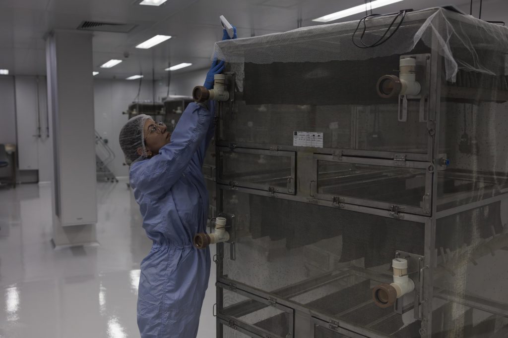 Para acceder a la planta de 1.300 metros cuadrados, los visitantes se tienen que poner bata y cubrirse el cabello con gorro de ducha. No es para protegerlos de los mosquitos, sino para proteger a los mosquitos de los visitantes y de los hongos que puedan cargar.