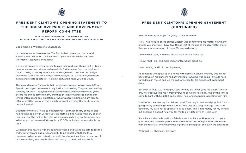 Este viernes 27 de febrero, el expresidente de los Estados Unidos, Bill Clinton, emitió a través de sus redes sociales su declaración inicial ante el Comité de Supervisión y Reforma Gubernamental de la Cámara de Representantes sobre el financiero y delincuente sexual Jeffrey Epstein.