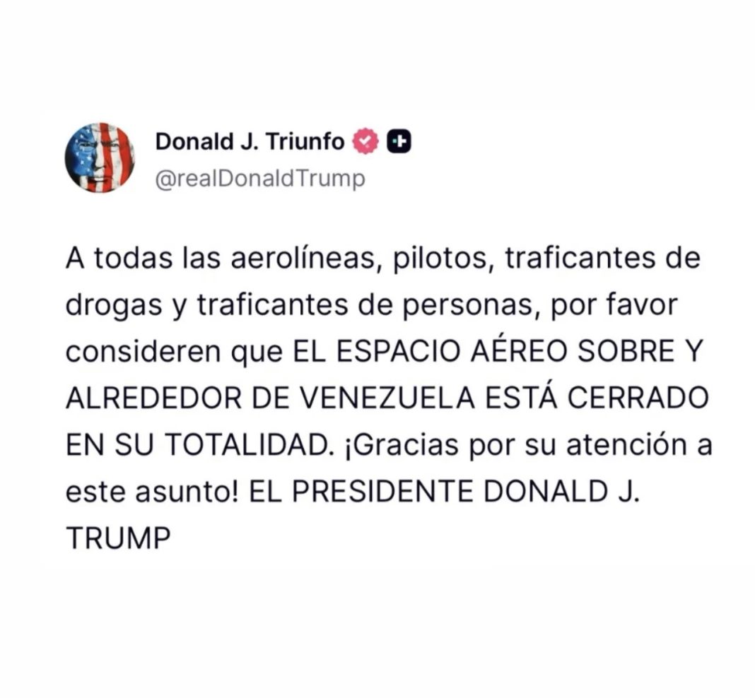 “A todas las aerolíneas, pilotos, narcotraficantes y traficantes de personas: les rogamos que consideren que el espacio aéreo sobre Venezuela y sus alrededores permanecerá cerrado en su totalidad. ¡Gracias por su atención! PRESIDENTE DONALD J. TRUMP”.