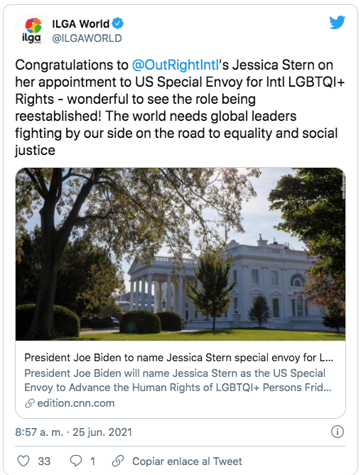 Durante el ‘Mes del Orgullo’ -junio- el presidente de los Estados Unidos, Joe Biden, como parte del reconocimiento de su administración a la comunidad LGBTQ; designó a Jessica Stern como enviada diplomática especial en el Departamento de Estado para los derechos LBTQ, informó AS en su portal.